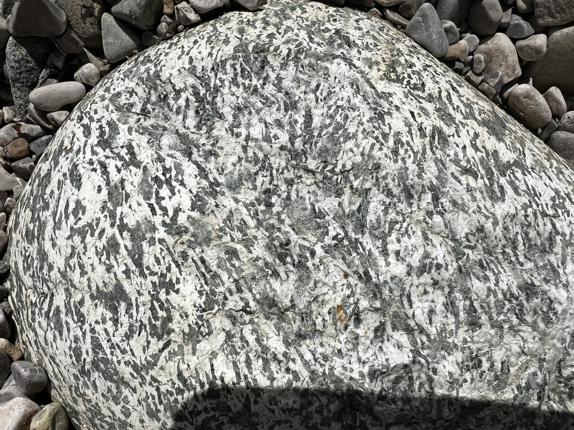 An den Ufern der Traun stößt man auf Kiesel, die eine unglaubliche Vielfalt geologischer Prozesse widerspiegeln. Neben den magmatischen und sedimentären Gesteinen, die von den Eiszeitgletschern und dem Fluss hierher transportiert wurden, finden wir auch eindrucksvolle Zeugen der tiefgreifenden Umwandlung der Erdkruste: die metamorphen Gesteine. Der hier abgebildete große, schwarz-weiß gesprenkelte Kiesel ist ein Paradebeispiel für einen Gneis.